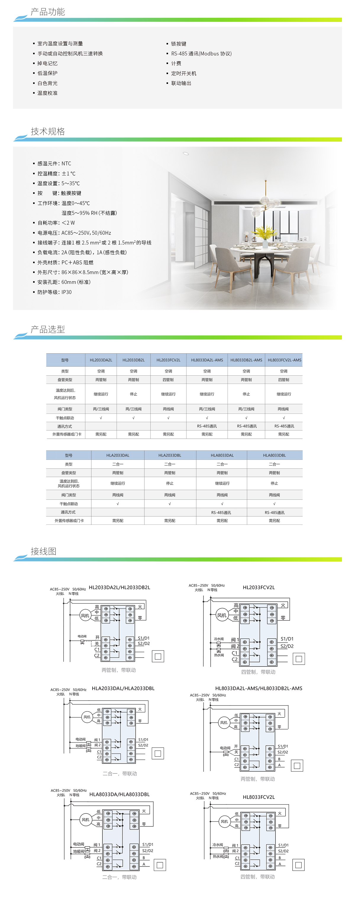 HL8033 系列溫控器超薄機身設計,纖薄靈巧,精致雅觀;大液晶屏,觸摸按鍵,高透亞克力面板,外觀簡潔大方,適用于工業、商業及家庭居室的溫度控制,控制普通交流三速風機盤管和閥門設備的開啟與關閉。采用 RS485 通訊方式,實現遠程集中控制與管理,并且通過監測風機和閥門的運行狀態,實現對空調的計量計費功能;空調采暖二合一,可聯動控制;尤其適用于辦公樓、商場、寫字樓、 公寓、住宅等項目使用。