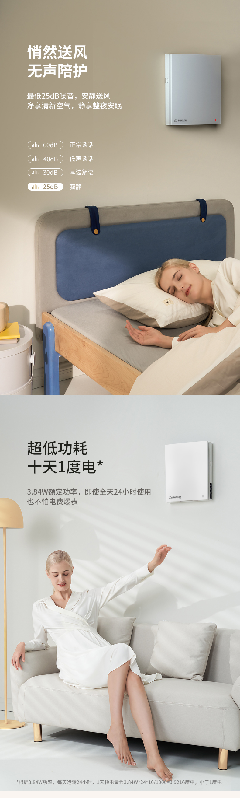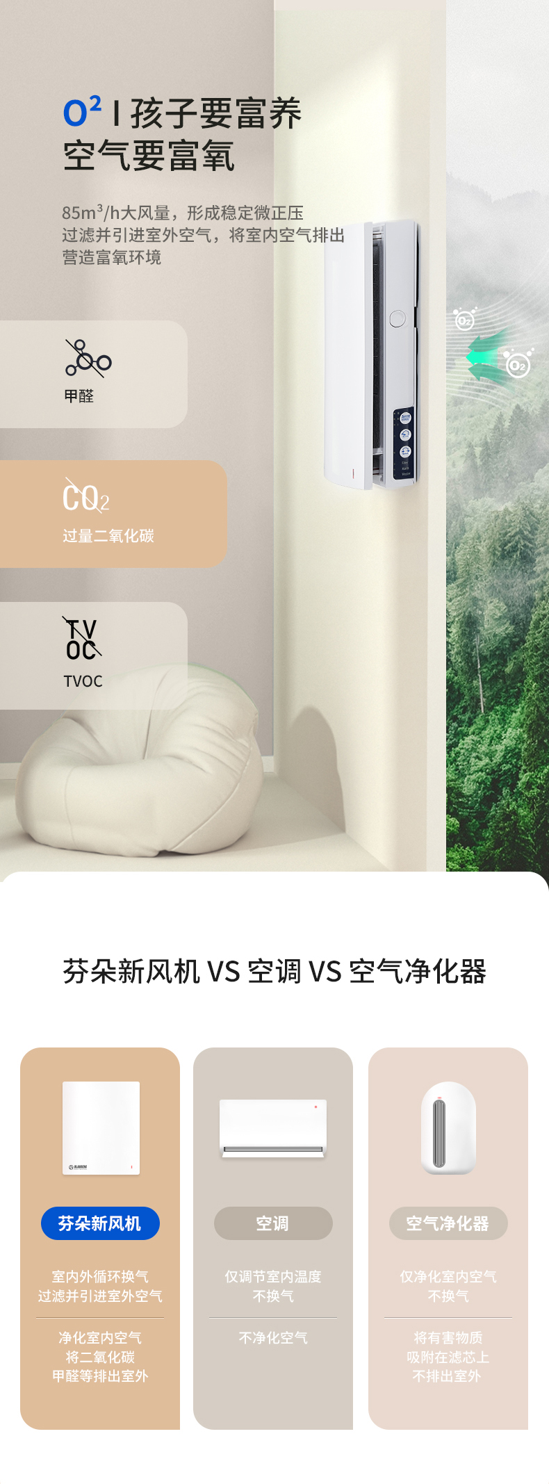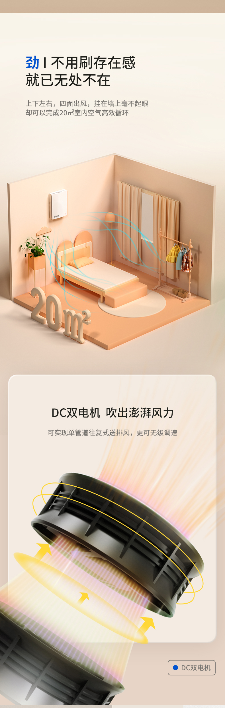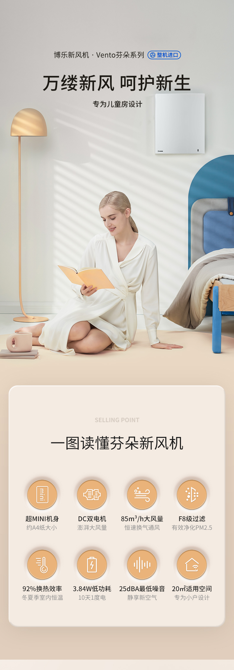 優勢:恒溫恒氧、高效除霾、靜音舒適、A+節能認證、APP智能控制、防風防雨、無級調速、簡致外觀。