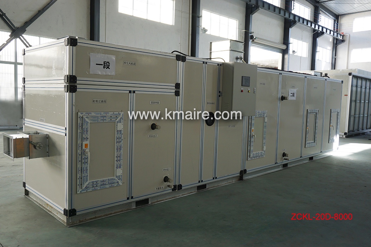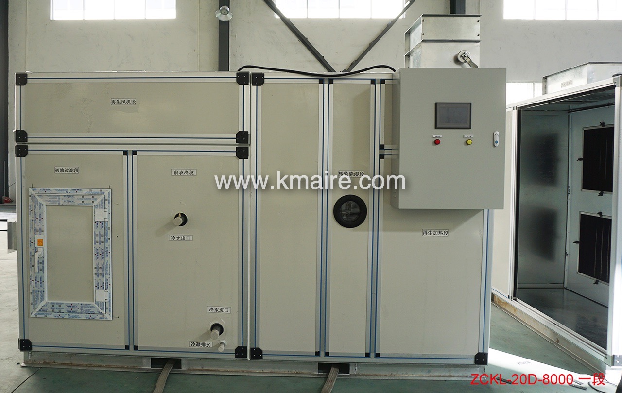 1、ZCKD低露點轉輪除濕機組主要由初效過濾段、新風表冷段、回風段、混合表冷段、超級硅膠或分子篩轉輪除濕段、冷吹再生區(qū)、后表冷段、中效過濾段、均流段、送風段和PLC電氣控制系統(tǒng)組成;