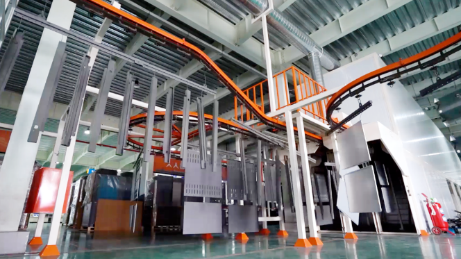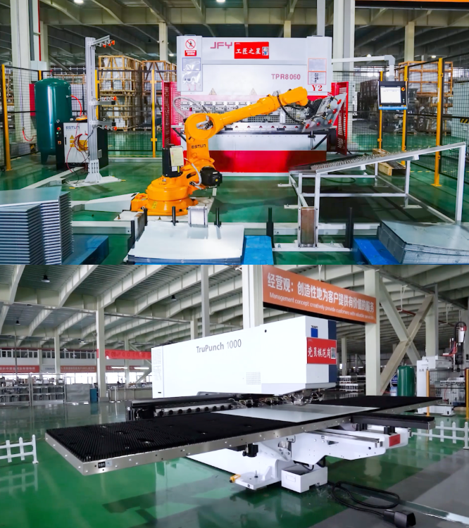 走進鈑金車間,鍍鋅板圈材經由瑞士百超迪能激光整平切割自動線精確地切割為標準件。德國通快高速沖床,搭載人工智能飛行沖切技術,以900次/min以上的沖速,實現配件快速成型,無需人工操作,極大程度地縮短了加工時長,實現生產效率大幅提升。